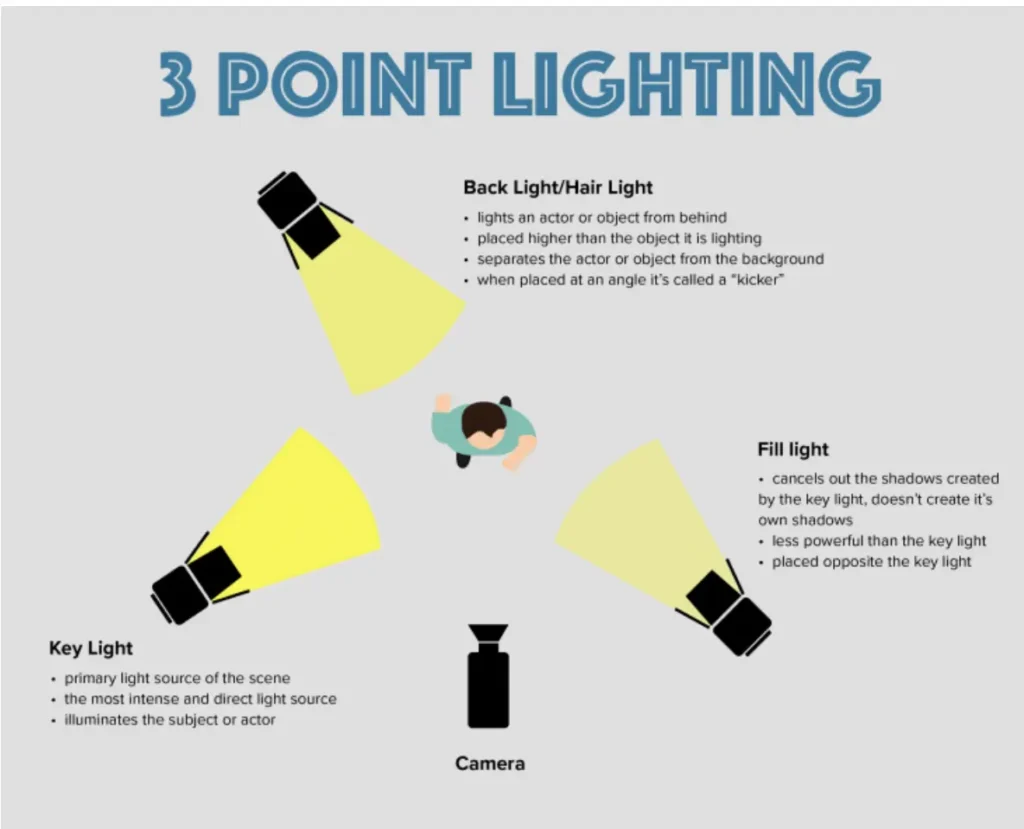 Fill Light: Placed on the opposite side to fill in shadows.