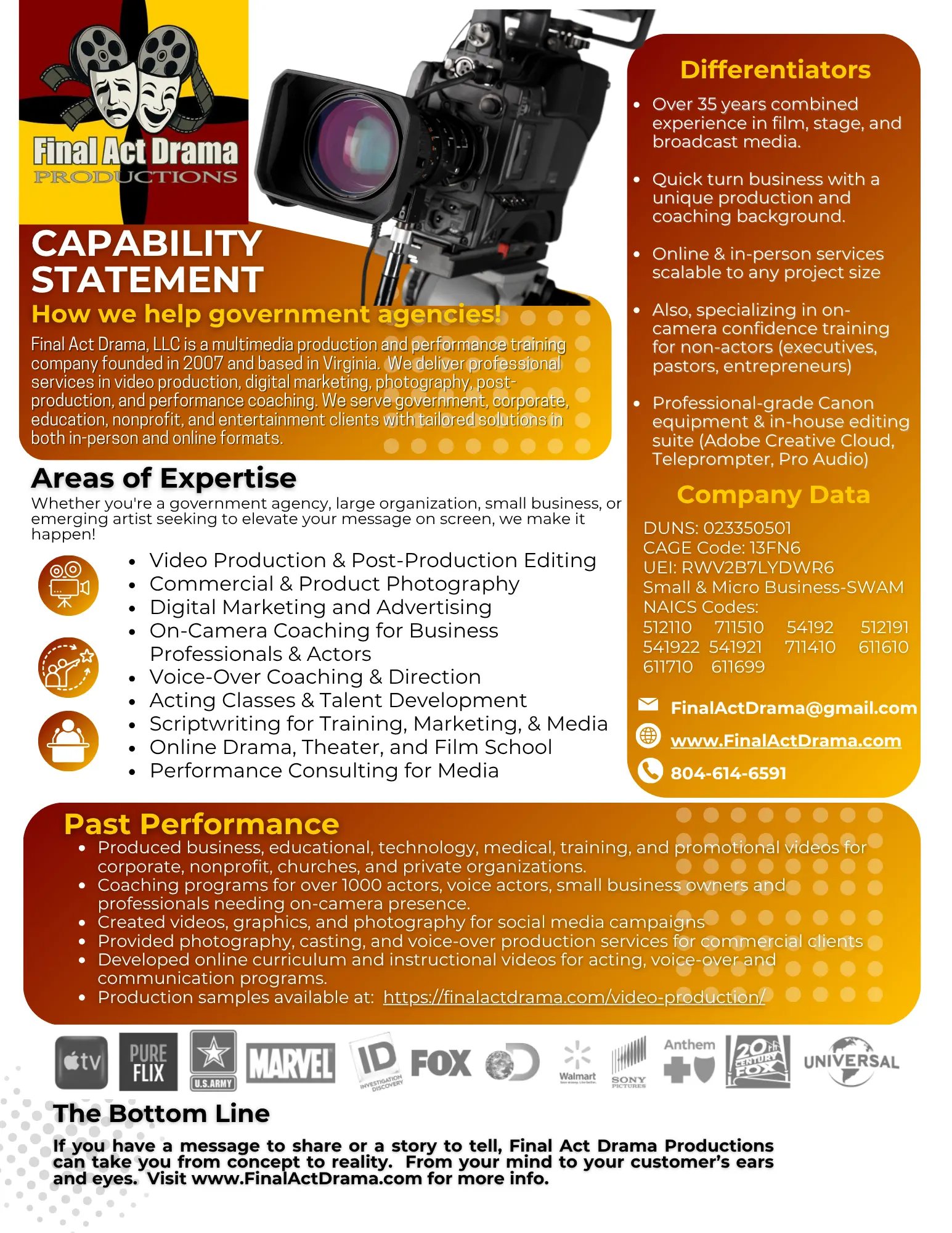 Final Act Drama, LLC is a multimedia production and performance training company serving in Virginia since 2007. We have extensive experience delivering professional services in video production, photography, post-production, and performance coaching. We serve government, corporate, education, nonprofit, and entertainment clients with tailored solutions in both in-person and online formats.